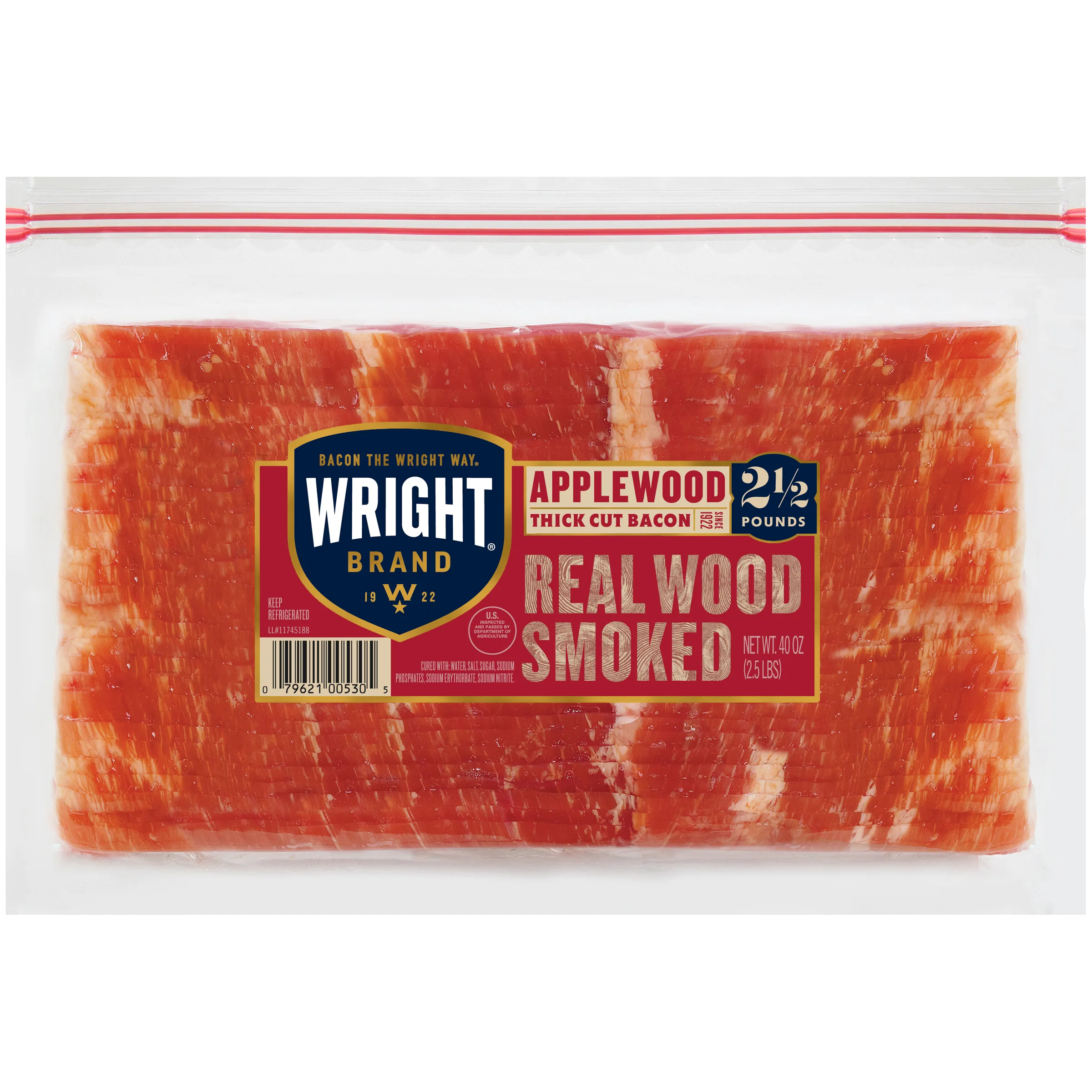 Wright Brand Applewood Real Wood Smoked Thick Cut Bacon delivers a perfectly balanced sweet and smoky flavor through traditional, slow smoking over real applewood. Smoked until each thick‑cut slice reaches a rich, reddish‑brown color, this bacon absorbs a light, fruity aroma with subtle sweetness in every bite. Hand‑trimmed and naturally smoked, it’s crafted for a hearty bacon experience that elevates everything from bacon and eggs to burgers, BLTs, and creative recipes. Each serving of one pan‑fried slice provides 5 grams of protein for satisfying flavor any time of day. This premium thick cut bacon brings dependable quality and standout taste to every meal.